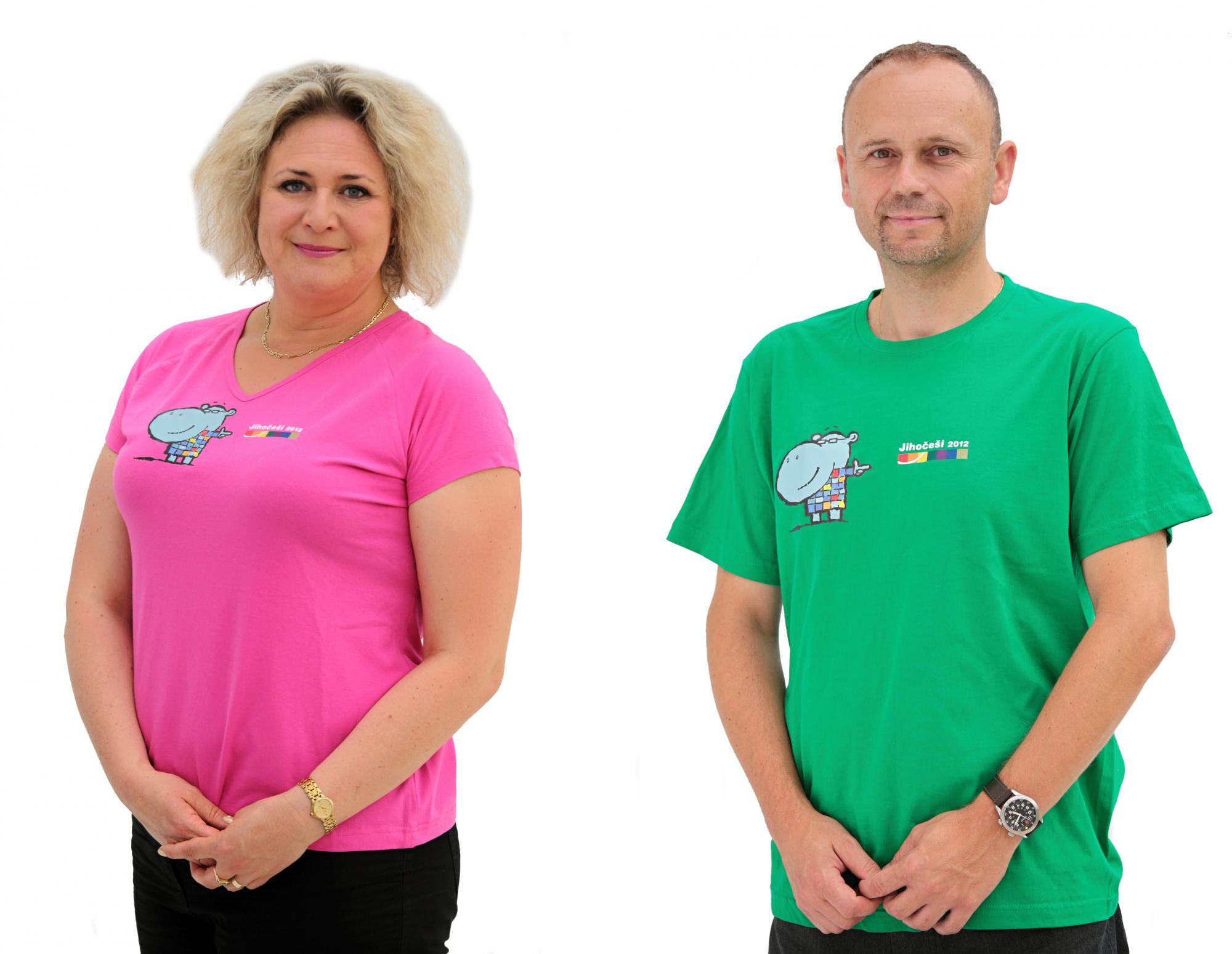 Jeden za všechny, všichni za jižní Čechy! Naše heslo pro letošní krajské volby, které vyjadřuje týmového ducha kandidátky hnutí Jihočeši 2012, posilují i další prvky. Třeba jednotná trika v pánském a dámském provedení. Uvidíte v nich ženy a muže, kteří budou Jihočechy 2012 reprezentovat během předvolební kampaně i v rámci některých dalších akcí. Na „dresech“ je vyvedeno logo našeho hnutí společně s maskotem hrošíkem Pavlem. Ten připomíná, že leaderem Jihočechů 2012 a kandidátem na hejtmana je Pavel Hroch. Na snímku jsou naši kandidáti Věra Korčaková a Martin Doležal.